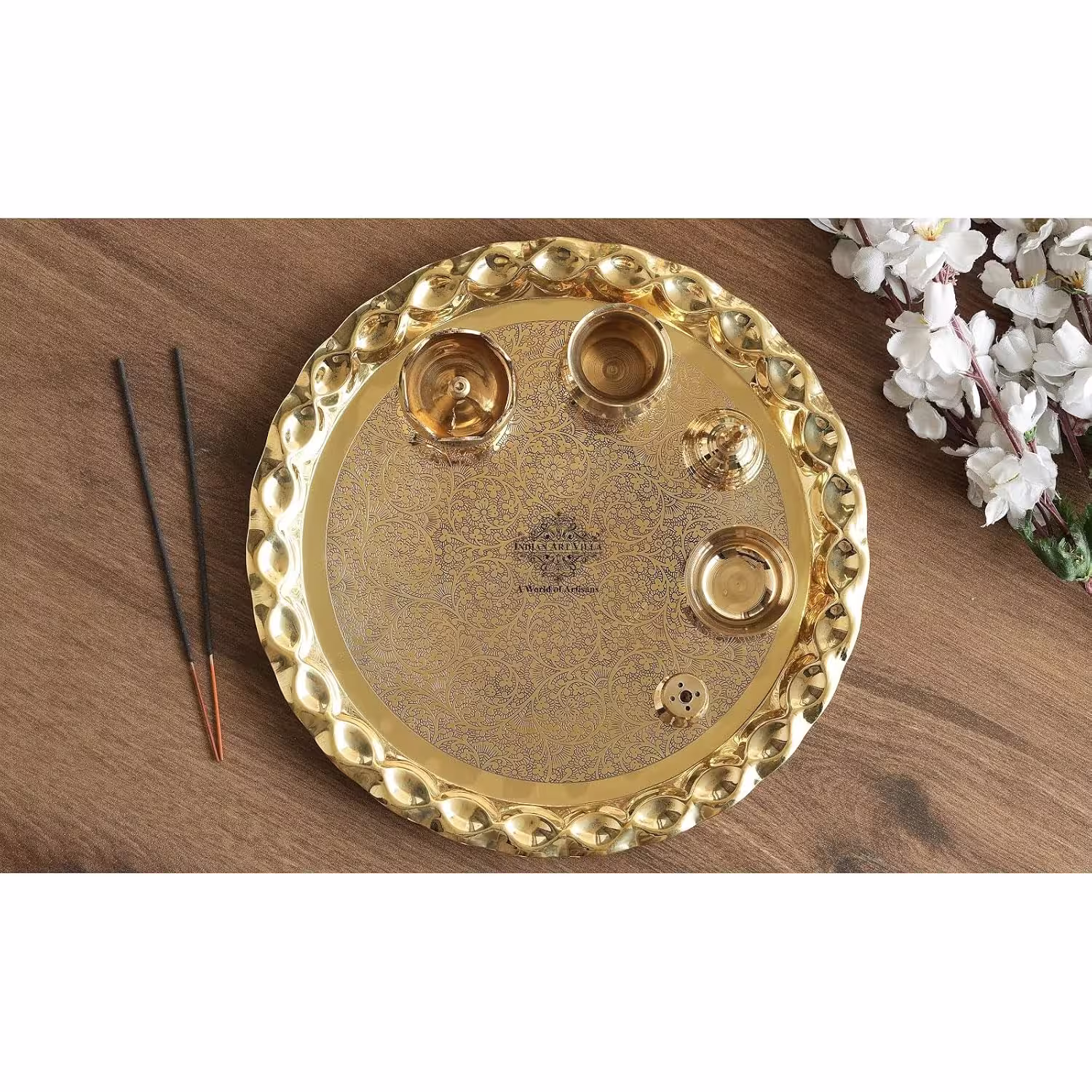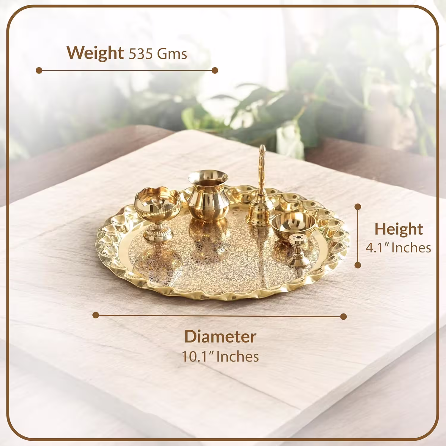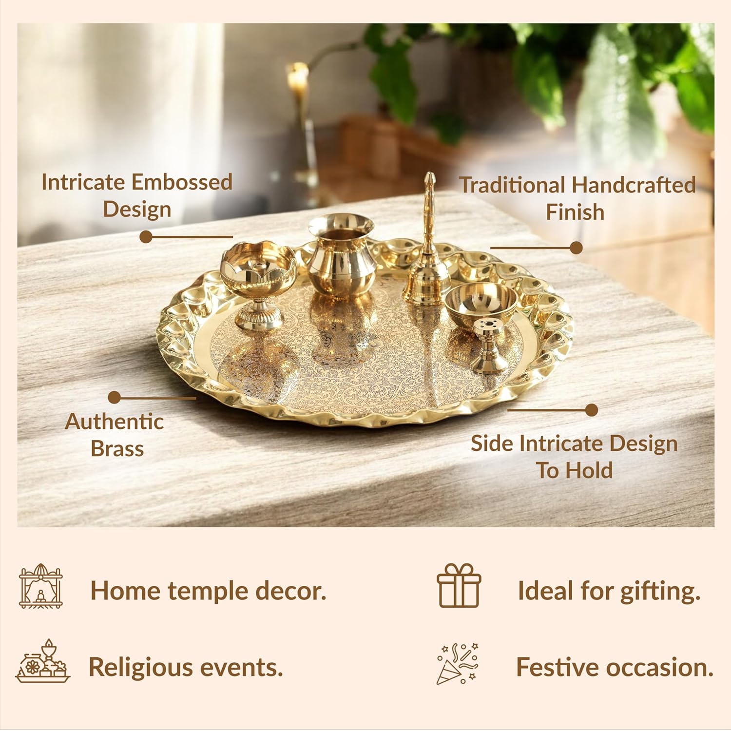 Pure Brass Pooja Thali Set with Floral Vines Embossed Design, Religious Spiritual Item, Home Temple, DIameter-10.1″ Inch